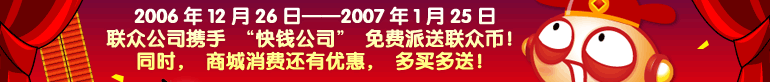 活动期间,所有在联众商城内使用快钱支付购买联众商品的新老用户,均可获得赠送商品价格6%联众币的优惠,多买多送!